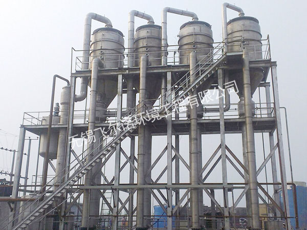 5、設備由一、二、三、多加熱器,一、二、三、多蒸發分離結晶室、循環管、汽液分離器、混合式冷凝器、真空泵、濃漿出料泵,一、二、三、多效強制循環泵、冷凝水泵、電控箱、工作臺及管路、閥門、儀表等組成。